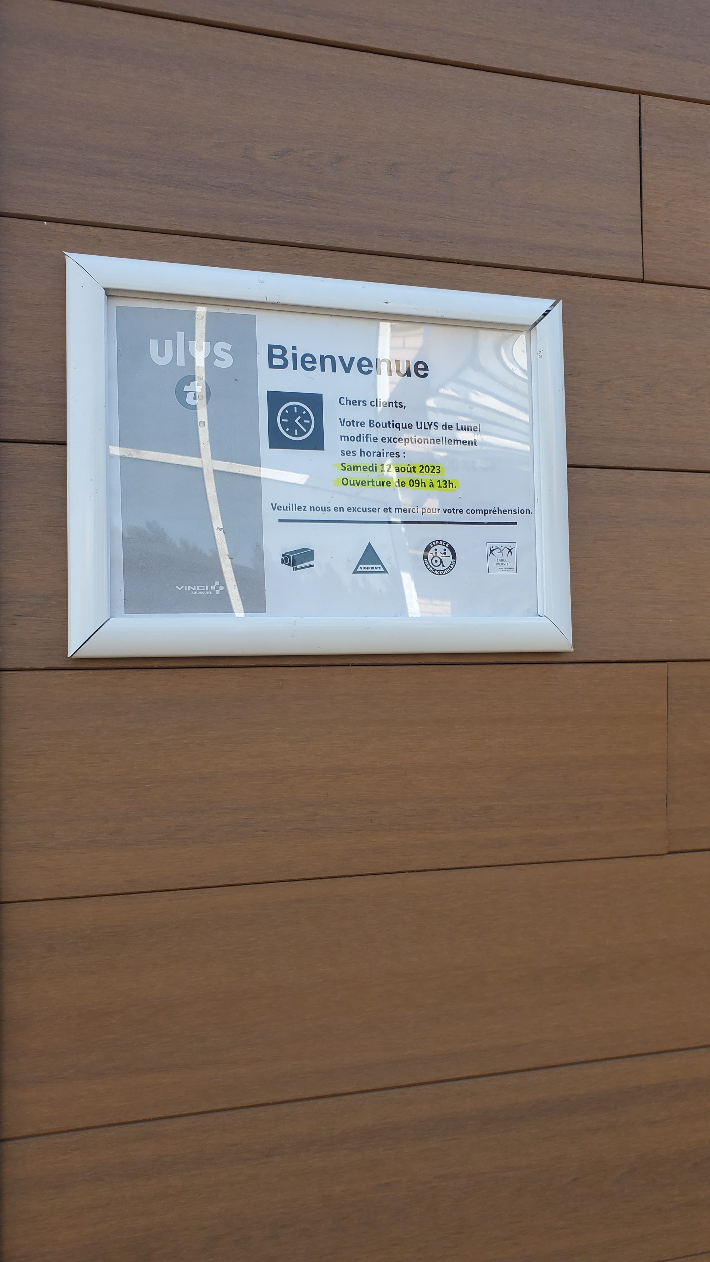 Ce matin j'appelle Ulys par téléphone pour savoir si la boutique est ouverte. On me confirme que la boutique est ouverte aujourd'hui de 9h à 13h. Je demande une confirmation au téléphone en disant êtes vous sûr que la boutique est ouverte car je me déplace exprès ? Oui oui c'est ouvert. Je me suis rendue devant la boutique à 10h30, boutique fermée... De plus, devant la porte de la boutique est écrit samedi 12/08/2023 ouverture de 9h à 13h mais la boutique est fermée. Cela est vraiment hallucinant et incorrect de votre part.